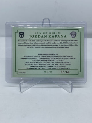 2025 NRL Traders 2024 Retirements Jordan Rapana Canberra Raiders RP 15/18 52/64