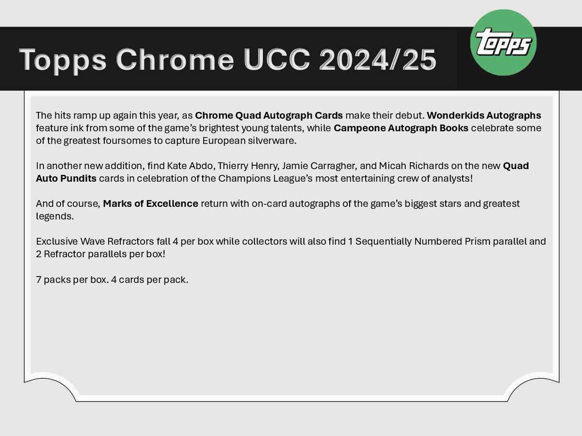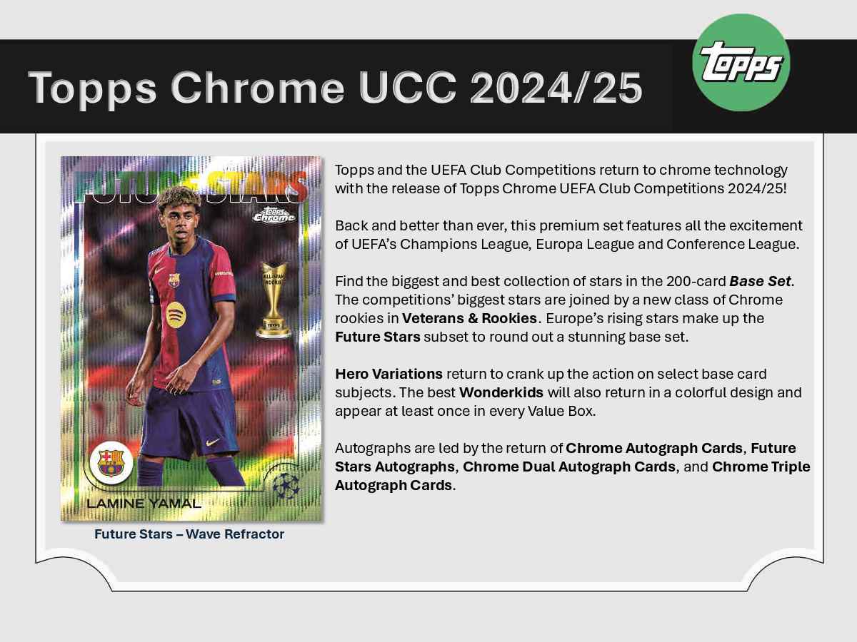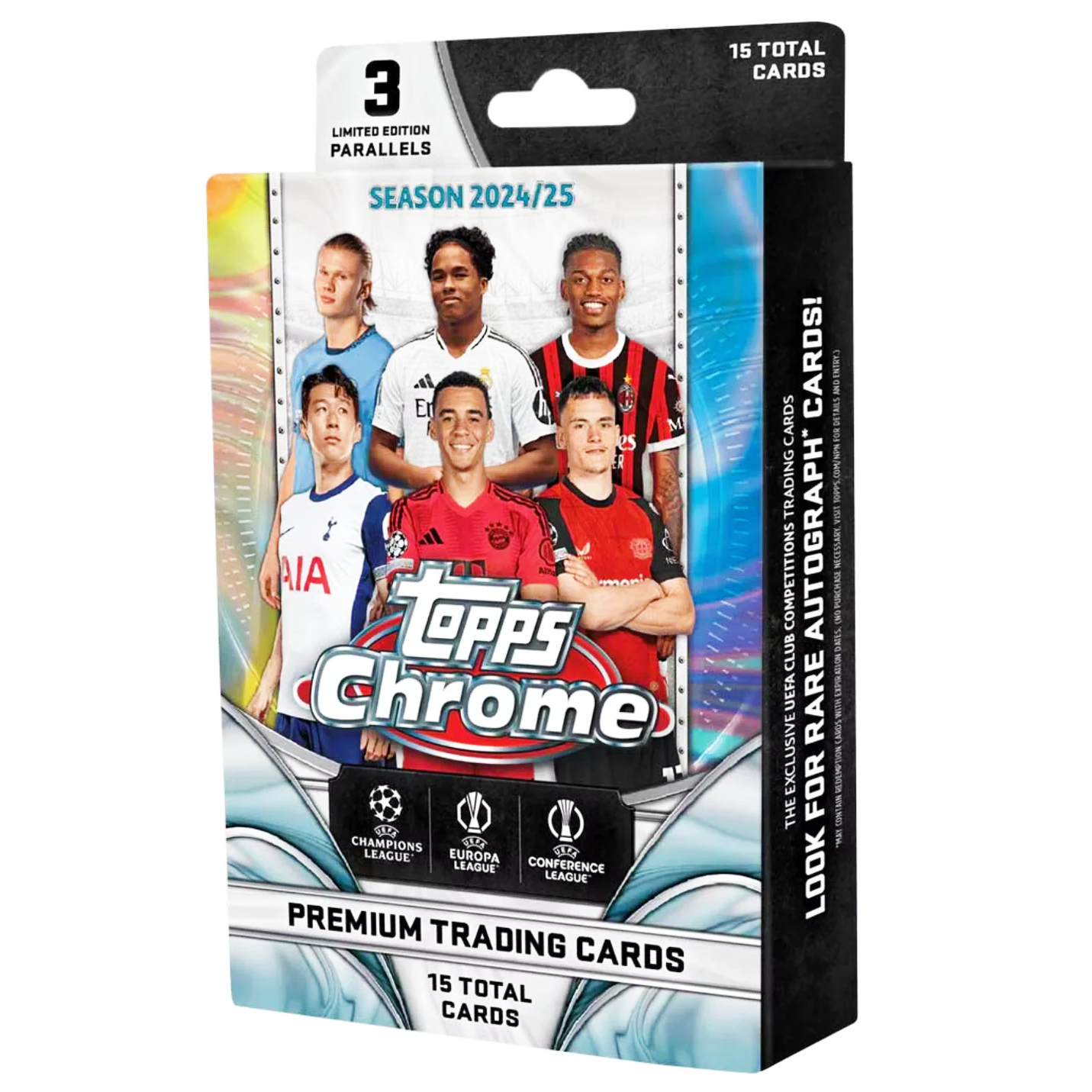 • Each hanger box contains fifteen (15) Topps Chrome 2024/25 UEFA Club Competitions cards including ten (10) base cards, three (3) base card magenta shimmer