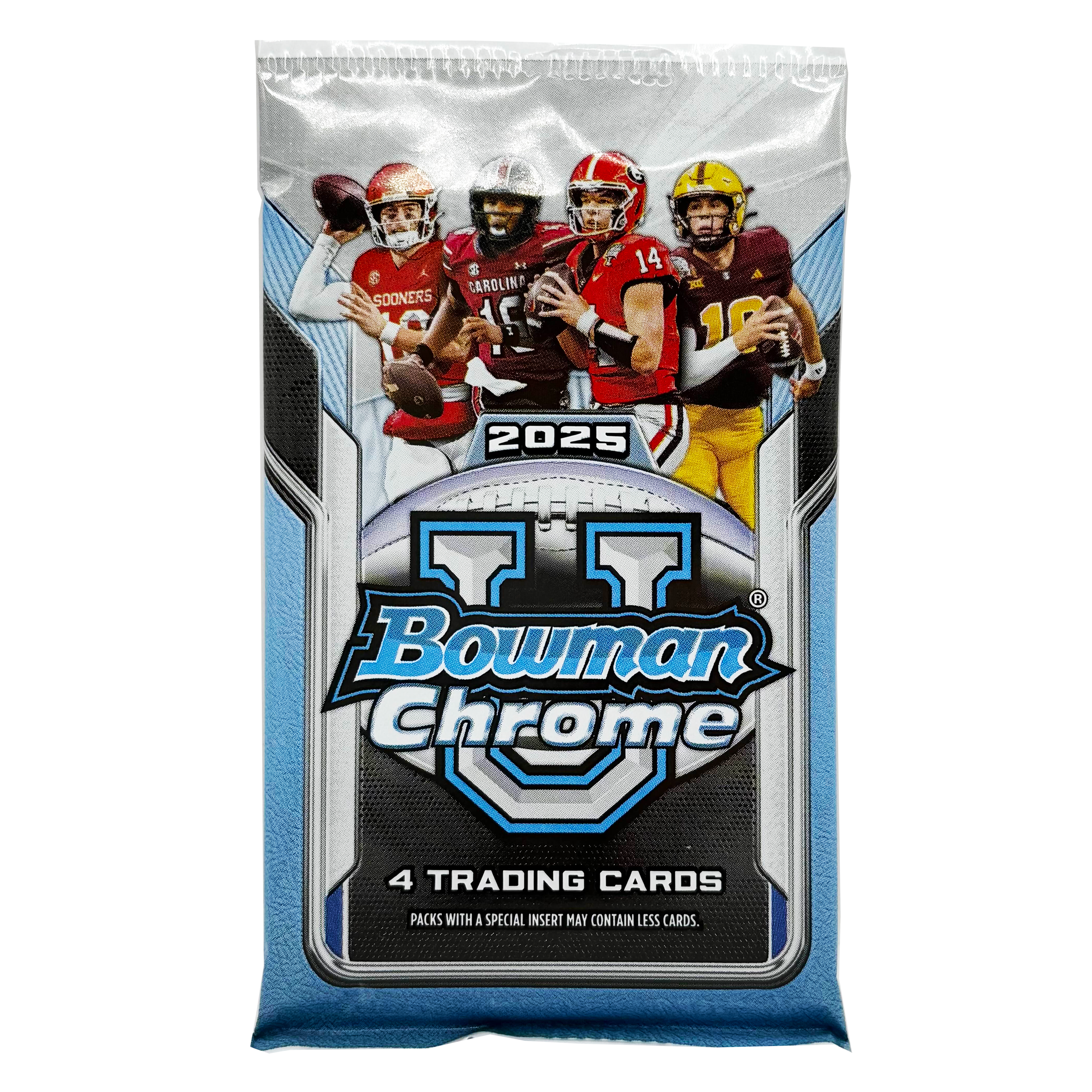 • 2025 Bowman University Chrome® Football storms back onto the field with a stacked checklist, fresh inserts, and the first Chrome® cards of tomorrow’s gridiron greats.
