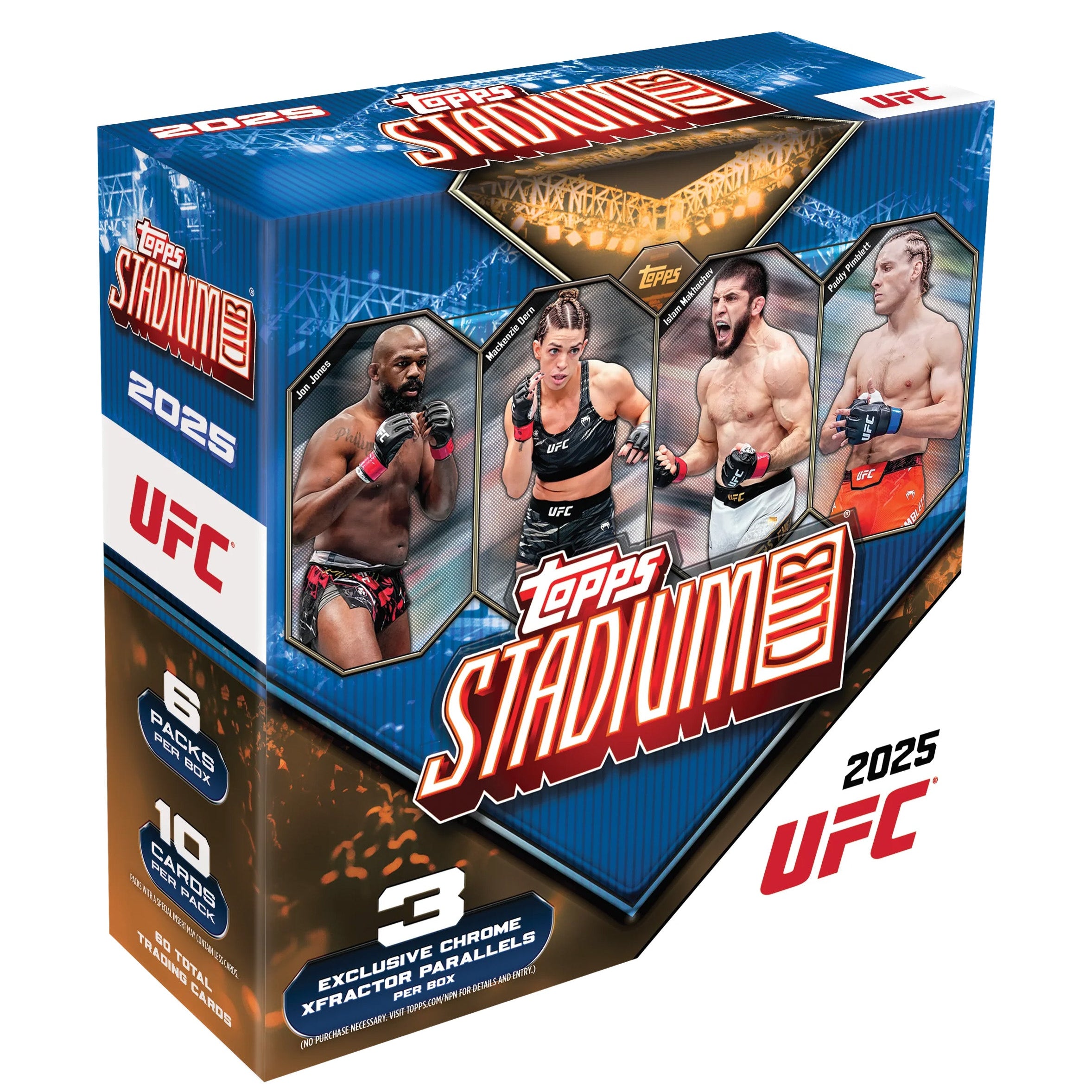 Step into the Octagon like never before with the 2025 UFC Topps Stadium Club Collection—a trading card set that brings the raw power, excitement, and unforgettable moments of UFC to life. Featuring dynamic photography, ultra-high-quality card stock, Chrome technology, and unique parallels, every card captures the intensity of each strike, submission, and knockout with unmatched clarity and energy.
