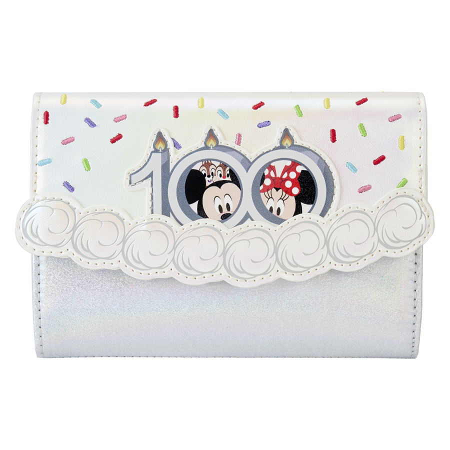 • The Loungefly Disney100 Celebration Cake Flap Wallet invites you to join the celebration of a lifetime. On the front, a confectionery wonder takes shape in the form of an anniversary cake.