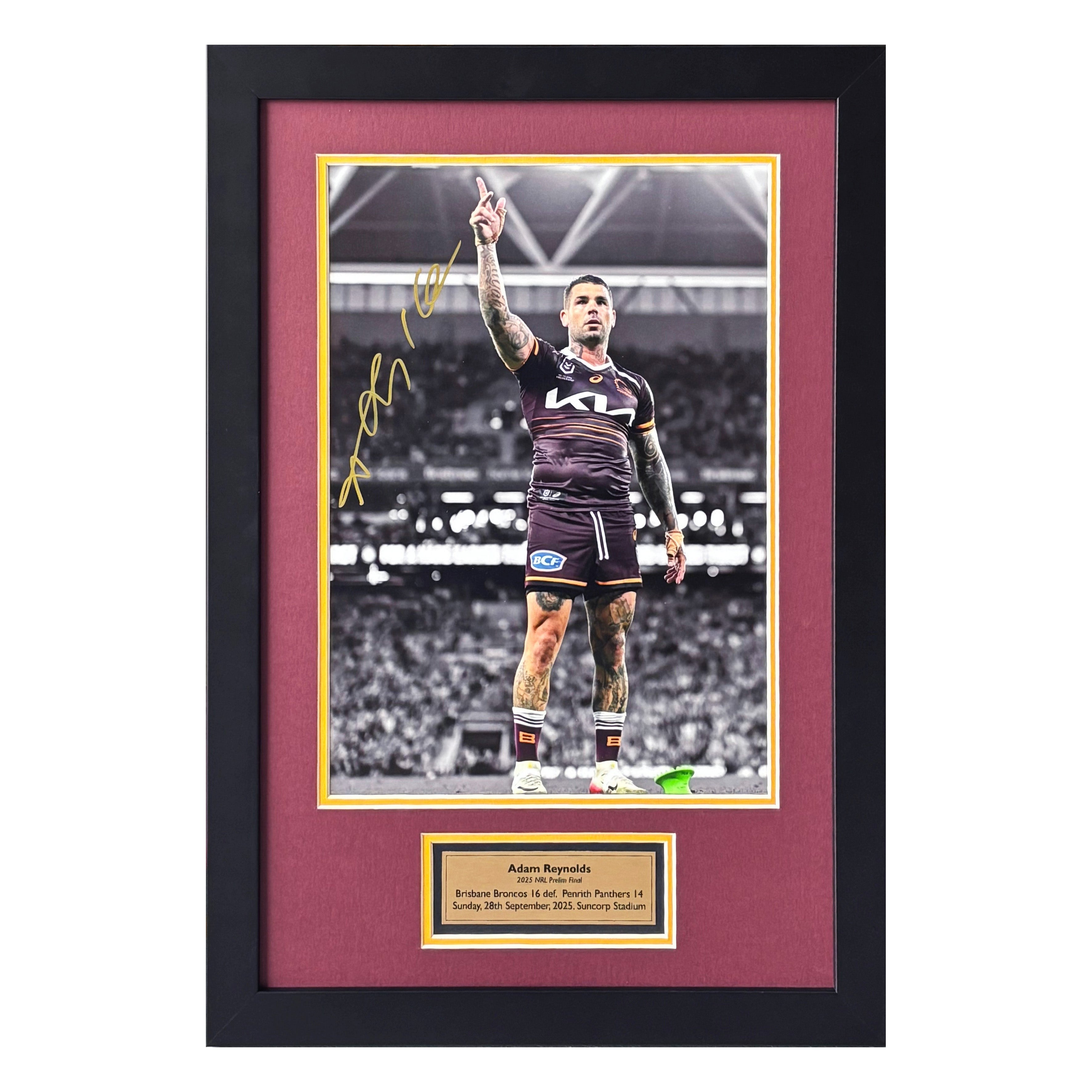 Personally hand-signed by Adam Reynolds, the photo is professionally framed in Broncos team colours with a gold-accented plaque noting the match details. Complete with photo proof of signing, this collectible is an authentic tribute to one of the defining moments of the Broncos’ 2025 campaign.