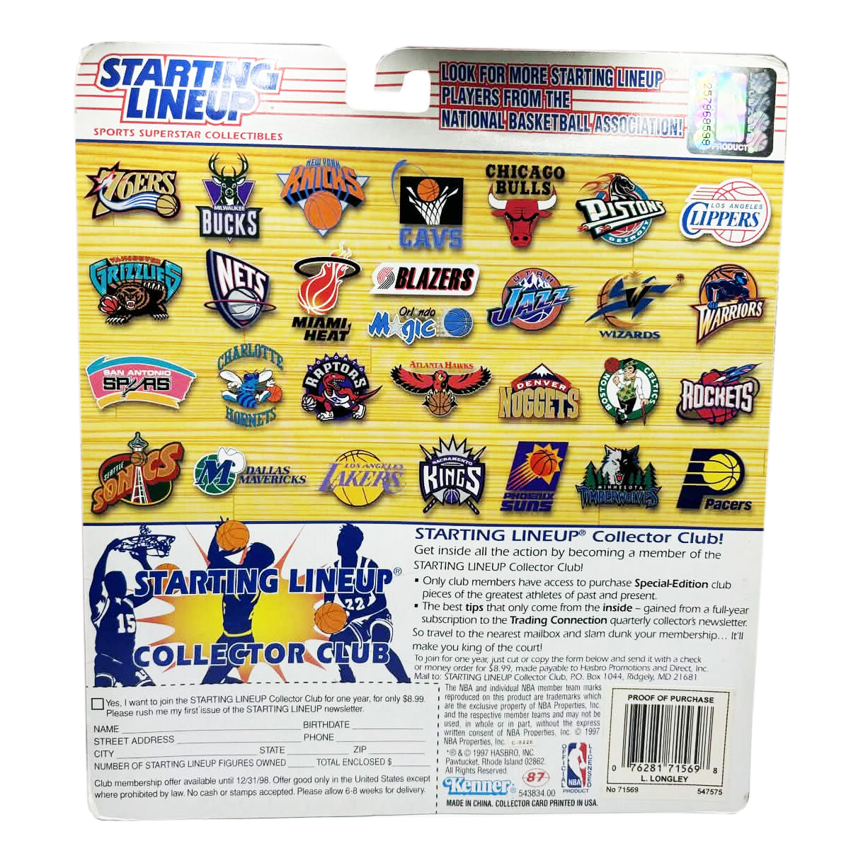 Produced by Kenner during the height of the Bulls dynasty, this collectible captures Longley in his iconic Bulls uniform and includes the original packaged trading card inside the blister.