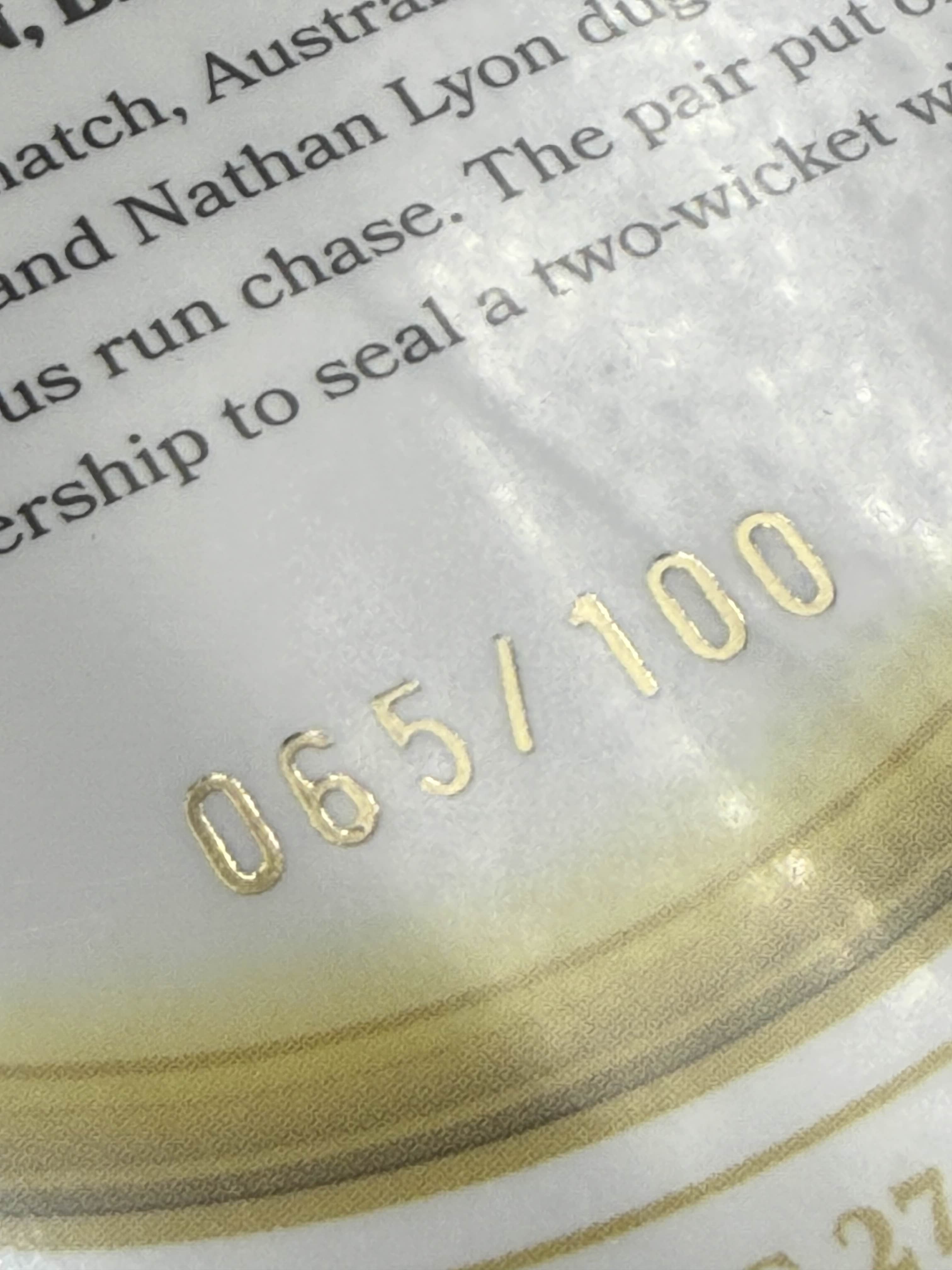 • 1x 2025 Cricket Australia Traders The Ashes Moments Gold Cummins And Lyon Carries Australia To Miracle Win 065/100 - AMG 27/30